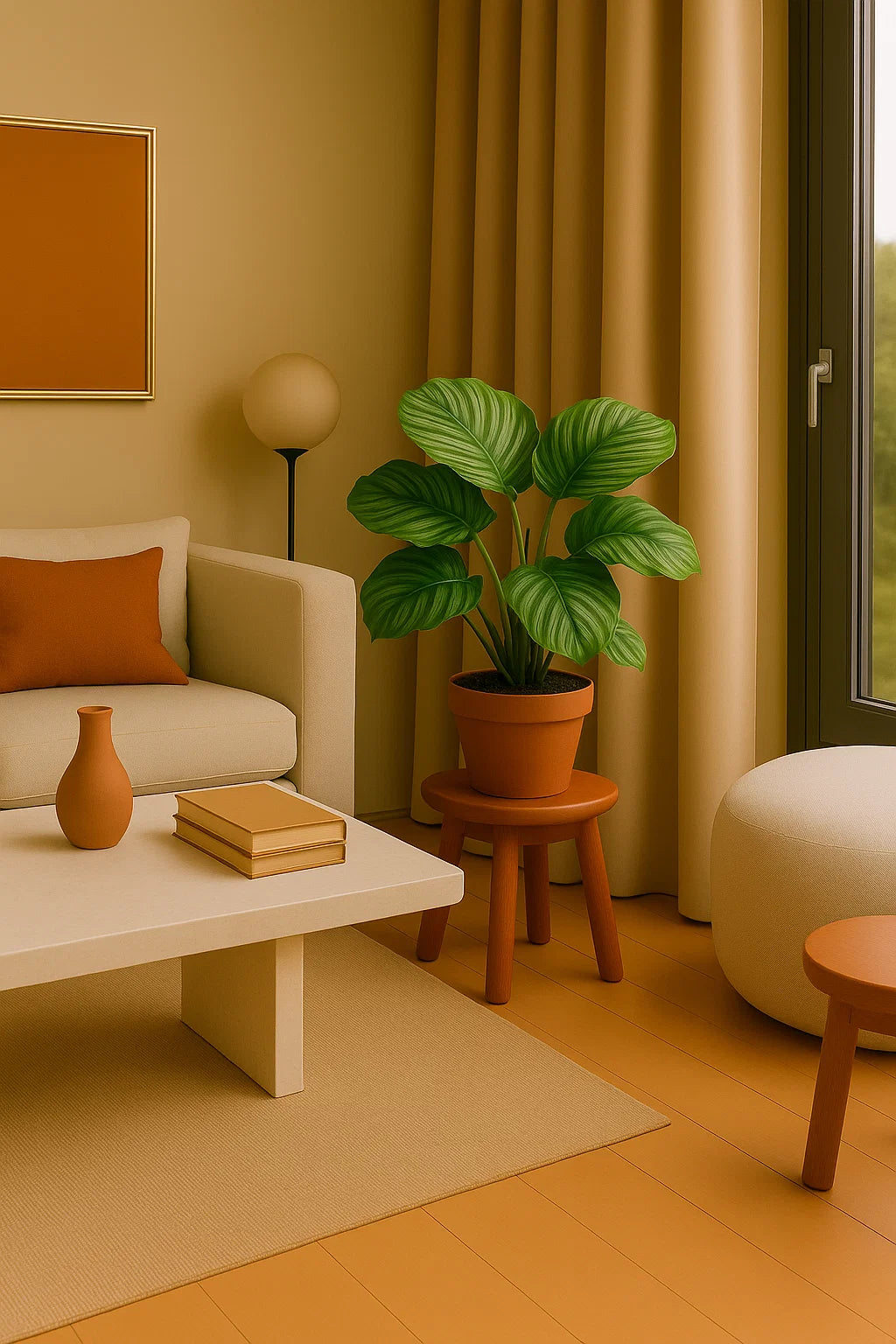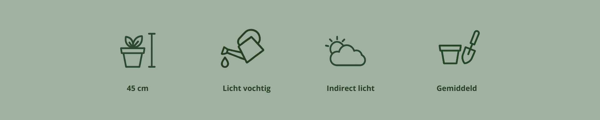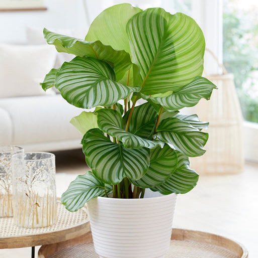 Deze Calathea wordt geleverd met een hoogte van circa 45 cm en een potmaat van Ø14 cm. Compact maar opvallend door het royale blad – perfect voor op een kast, dressoir of als accentplant in een groene hoek.