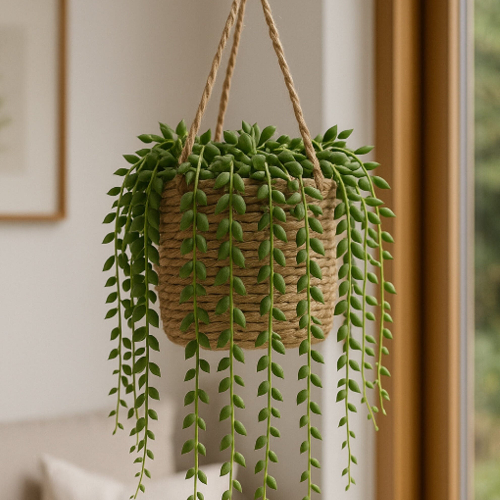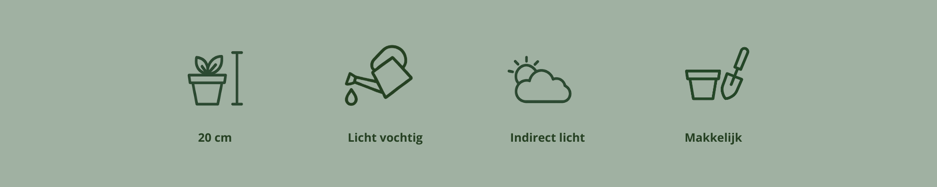Deze plant heeft een hoogte van ongeveer 20 cm en een potmaat van Ø12 cm. Compact maar opvallend – ideaal voor op een plank, bijzettafel of in een open kast. Naarmate ze groeit, krijgt ze ook een iets hangend karakter.